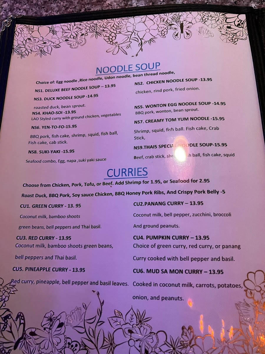 Choose Chicken, Pork, Tofu, or Beef (Shrimp or Seafood for an additional charge), Coconut milk with galangal root, kefir lime, lemongrass, mushroom, onion & cilantro.